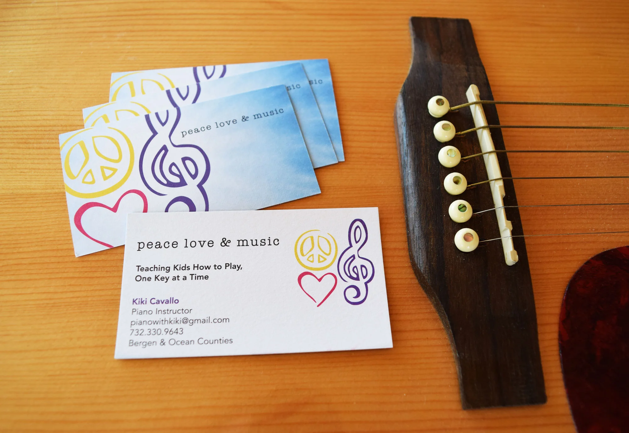Hand illustrated logo and business card design for Peace Love & Music, a music lesson business in New Jersey
